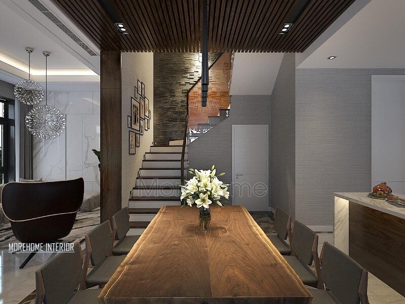 Mẫu bàn ăn gỗ óc chó nguyên tấm kết hợp với ghế ăn bọc nệm tạo nên bộ bàn ăn sang trọng cho không gian phòng ăn biệt thự gia chủ