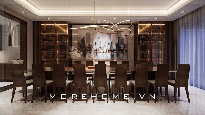 Tâm điểm của không gian phòng ăn biệt thự, nhà phố cao cấp là mẫu bàn ăn gỗ óc chó cao cấp kết hợp vỏ bọc da màu trắng sang trọng ấn tượng.