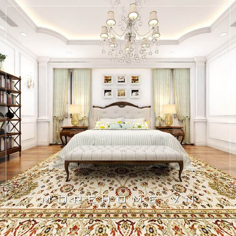 Trang trí nội thất phòng ngủ biệt thự cao cấp tại Hà Nội với mẫu giường ngủ gỗ tự nhiên nhập khẩu bọc nỉ nhung ấn tượng