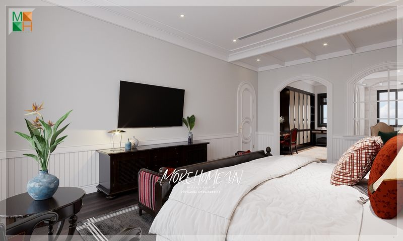 Không gian phòng ngủ master được thêm sự sang trọng bởi nội thất gỗ tự nhiên sơn đen được thiết kế theo phong cách Indochine.