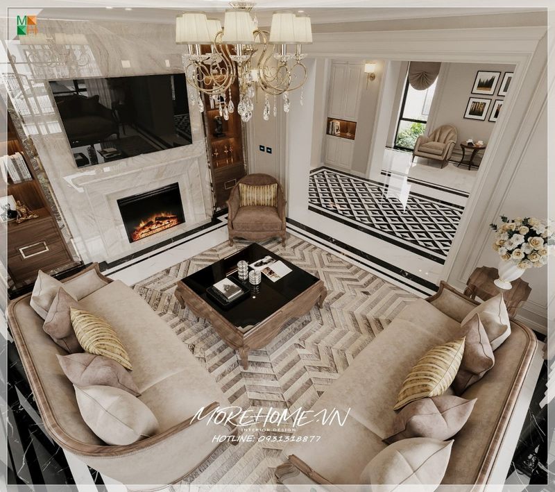 . Sofa phòng khách được thiết kế theo phong cách tân cổ điển sang trọng, được bọc bằng da cao cấp màu kem, tạo nên không gian tinh tế và sang trọng.